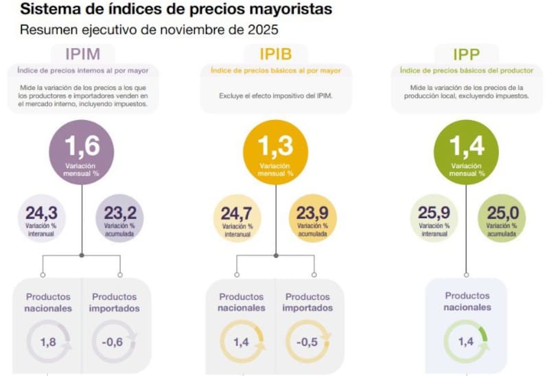 Los precios mayoristas registraron un aumento de 1,6% en noviembre de 2025 respecto del mes anterior, informó este miércoles el INDEC. El mes anterior habían subido 1,1%, es decir que aceleraron.