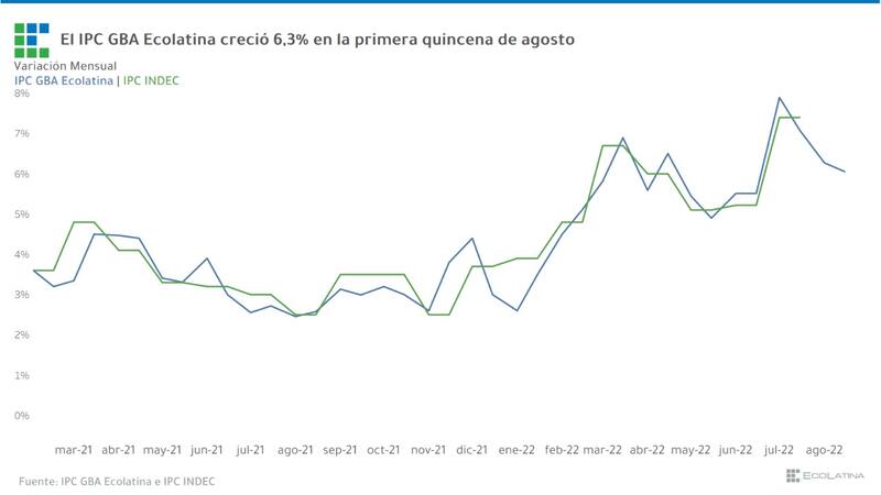 Aunque refleja una desaceleración de 1,6 puntos porcentuales, sobre la primera quincena del mes anterior, del 1 al 15, el IPC de Ecolatina marcó 6,3%, y para el mes completo proyecta un 6,2%, lo que indica un 74,6 % interanual, y un acumulado de 53,1%.