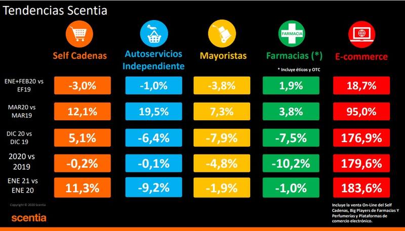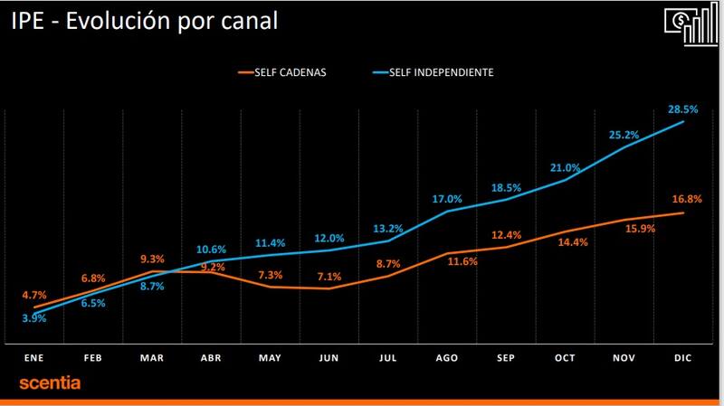 Según un informe de la consultora Scentia, entre enero y marzo de 2020, el Índice de Precios de productos Empaquetados (IPE), que releva 1044 productos con códigos de barra (no contempla productos frescos pesables) mostró una evolución dispar según los canales.