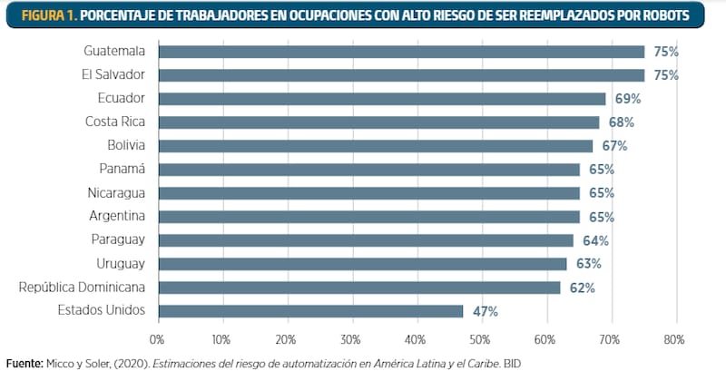 De acuerdo las estimaciones llevadas a cabo por Carl Frey y Michael Osborne, dos académicos de la Universidad de Oxford en 2013 sobre la economía de Estados Unidos, casi la mitad de los trabajadores (el 47%) estaban en riesgo de ser reemplazado por robots para el año 2030, mientras que elBanco Interamericano de Desarrollo (BID), al trasladar el análisis, advirtió que en Argentina ese porcentaje se elevaría al 65%.