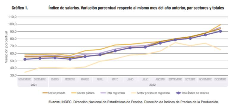 Este dato revela que el poder adquisitivo del total de sueldos quedó 3,4% por debajo de la inflación, algo de lo que solo se salva el sector público que creció 99,4 de enero a diciembre del 2022. En el caso de los privados el aumento fue de 93,8 y de los no registrados de 65,4, por lo que los trabajadores "en negro" perdieron 29,4% de su salario.