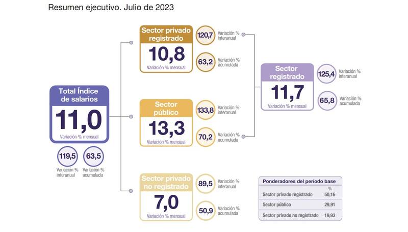 El índice general de salarios, que difunde el Indec, tuvo un aumento de 11% en el mes de julio pasado, varios puntos porcentuales por encima de la inflación, ya que en ese mismo periodo el aumento de precios experimentó una suba de 6,3%. El indicador acumula una suba del 63,5% respecto de diciembre previo y de 119,5% repecto del mismo mes del año pasado.