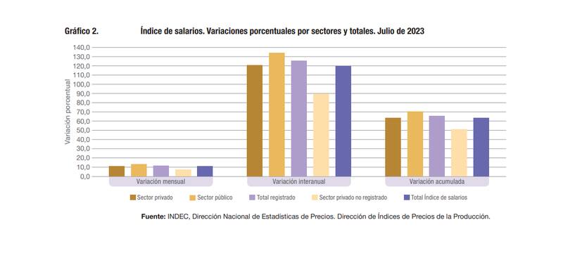 El índice de salarios se descompone por sectores, de acuerdo a la forma y ámbito de contratación, cada uno con su propia dinámica de variación. De esta manera se tiene que el "sector privado registrado" tuvo una suba de 10,8%, mientras que el sector público fue el más favorecido en este mes, ya que trepó 13,3%. En tanto, el sector privado no registrado, donde priman los trabajadores informales, tuvo la menor variación del periodo con una suba de 7%.