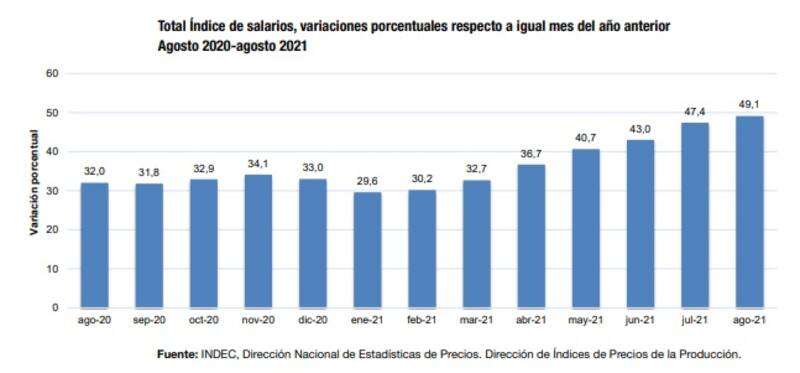 En el acumulado de los últimos doce meses, en tanto, los salarios en el conjunto de la economía avanzaron 49,1%, precisó el organismo estadístico oficial, incluso con variaciones más notorias entre los diversos segmentos.