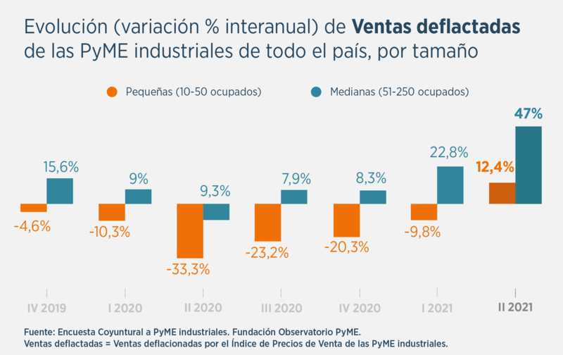 A diferencia del 2020, el "peor período" en términos de restricciones, "durante el segundo trimestre de 2021 la actividad de las PyME manufactureras mostró un desempeño positivo (+27,4% en promedio)", arrojó la entidad en su informe, al tiempo que añadió que "después de tres años, es la primera vez que tanto las firmas pequeñas como las medianas muestran ambas tasas positivas en la evolución de las ventas en términos reales".