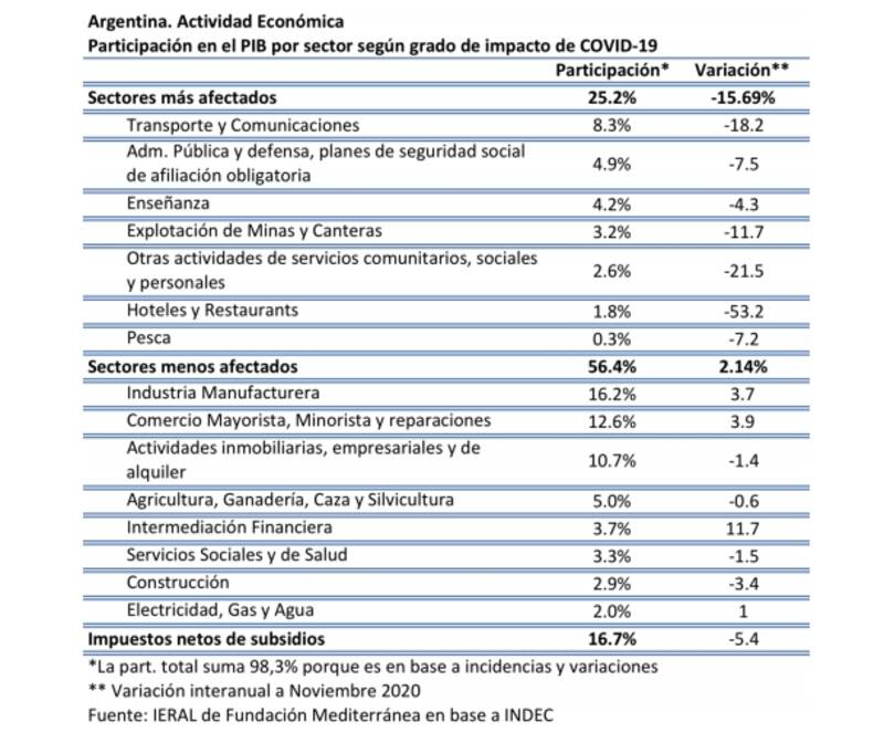 Es que los sectores más afectados registraron en promedio en noviembre una caída interanual ponderada de 15,7% y representan un 25,2% de la actividad económica. Este segmento incluye a transporte y comunicaciones, administración pública, enseñanza, explotación de minas y canteras, actividades de servicios comunitarios, pesca y hoteles y restaurantes.