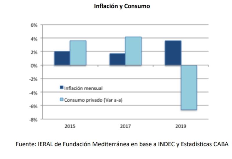 En 2019, una inflación promedio mensual de 3,6% trajo aparejada una contracción del consumo de 6,6%, mientras que en 2017 la inflación había sido de 1,7% mensual y el consumo había trepado 4,2% en el año.