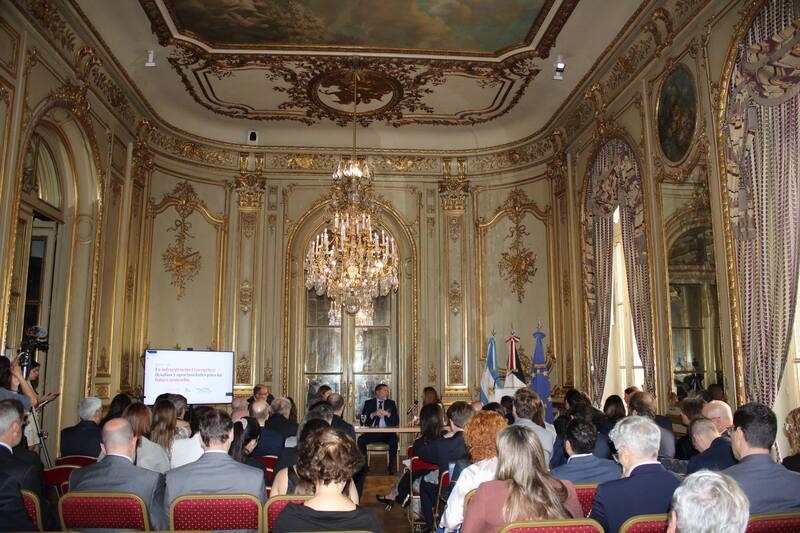 El anfitrión de la jornada, Romain Nadal, destacó el "formidable" potencial energético de la Argentina con abundantes recursos de hidrocarburos en Vaca Muerta, energías renovables -solar, eólica, hidroléctrica, biomasa- con minerales críticos como litio, cobre y como el único país con energía nuclear "libre de carbono y competitiva".