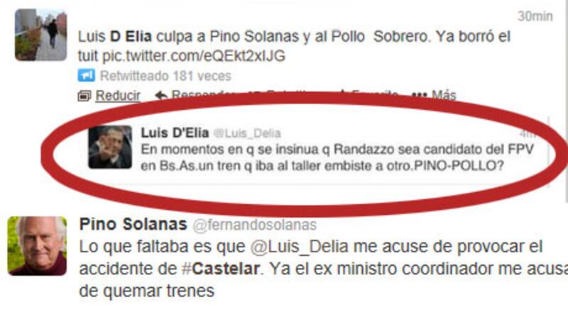 Fue a través de un twett que luego borró de su cuenta @Luis_Delia que decía: “En momentos en que se insinúa que (el ministro de Interior Florencio) Randazzo sea candidato del FPV en Buenos Aires un tren que iba a un taller embiste a otro. Pino Pollo?”.