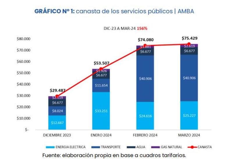Esta misma canasta de servicios públicos en diciembre pasado era de $29.487, por lo que el costo se incrementó 156% en tres meses. Según el IIEP esto ocurrió "a partir de las actualizaciones de tarifas de transporte y energía eléctrica, ya que los cuadros tarifarios de agua y gas natural no han sido modificados hasta el momento". Además, ajusta los consumos de gas y luz por estacionalidad.