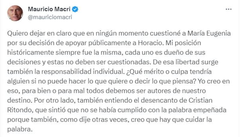 "Quiero dejar en claro que en ningún momento cuestioné a María Eugenia por su decisión de apoyar públicamente a Horacio. Mi posición históricamente siempre fue la misma, cada uno es dueño de sus decisiones y estas no deben ser cuestionadas", escribió en Twitter.