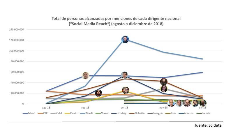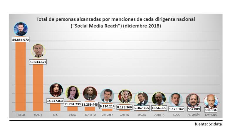 De acuerdo a un estudio hecho por la consultora Scidata, en diciembre, más de 53 millones de personas mencionaron a Mauricio Macri, mientras que algo más de 15 millones a CFK. El tercer lugar en el podio de dirigentes políticos se lo lleva la actual gobernadora de Buenos Aires, María Eugenia Vidal.