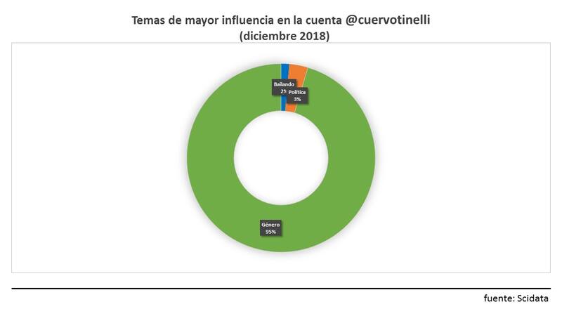 Según el informe, en la cuenta de @cuervotinelli, por lejos, el tema de mayor influencia tuvo que ver con género (95%). El tema política ocupó, muy por debajo, el segundo puesto, con el 3%.