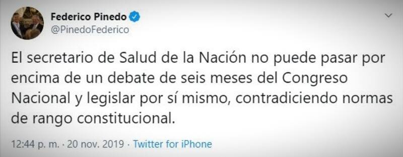 Y añadió: “El secretario de Salud de la Nación no puede pasar por encima de un debate de seis meses del Congreso Nacional y legislar por sí mismo, contradiciendo normas de rango constitucional .