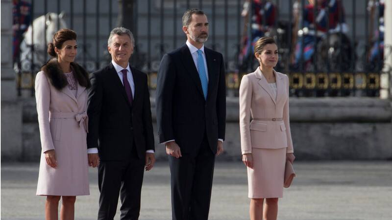 Macri y la primera dama, Juliana Awada, fueron recibidos hoy con honores militares por los reyes de España, Felipe VI y Letizia, en el Palacio Real de Madrid al inicio de su visita de Estado al país ibérico.