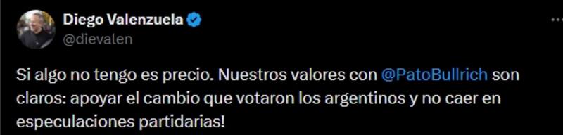 El jefe comunal se sintió aludido y respondió: "Si algo no tengo es precio. Nuestros valores con Patricia Bulrrich son claros: apoyar el cambio que votaron los argentinos y no caer en especulaciones partidarias!"