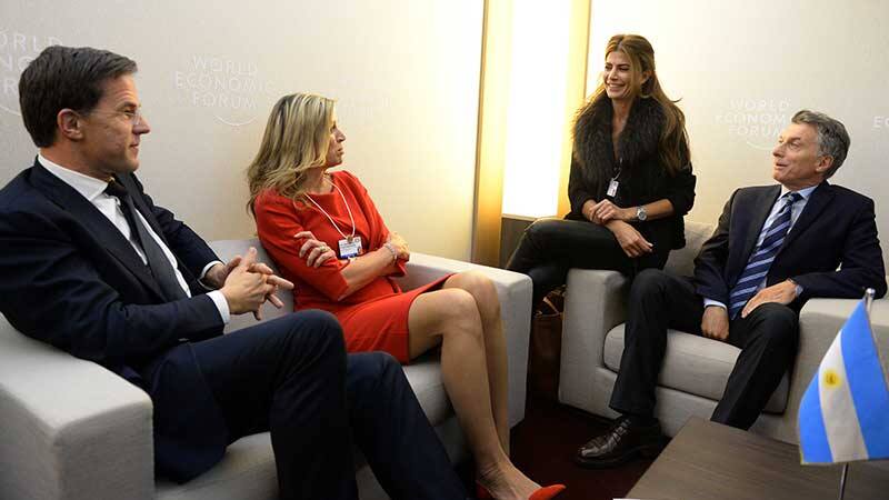 Y el tercero, con un tono que las fotos muestran como evidentemente relajado, con la reina Máxima de Holanda y el primer ministro de ese país, Mark Rutte.