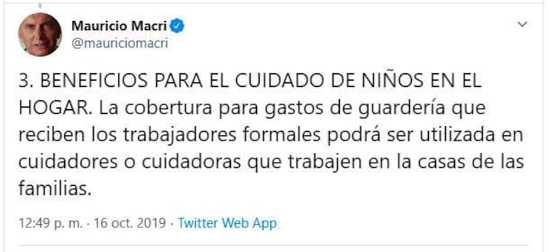 Además, Macri anticipó que se van a lanzar beneficios para el cuidado de los hijos, como un plan para que "la cobertura para gastos de guardería que reciben los trabajadores formales" pueda ser utilizada "en cuidadores o cuidadoras que trabajen en la casas de las familias".
