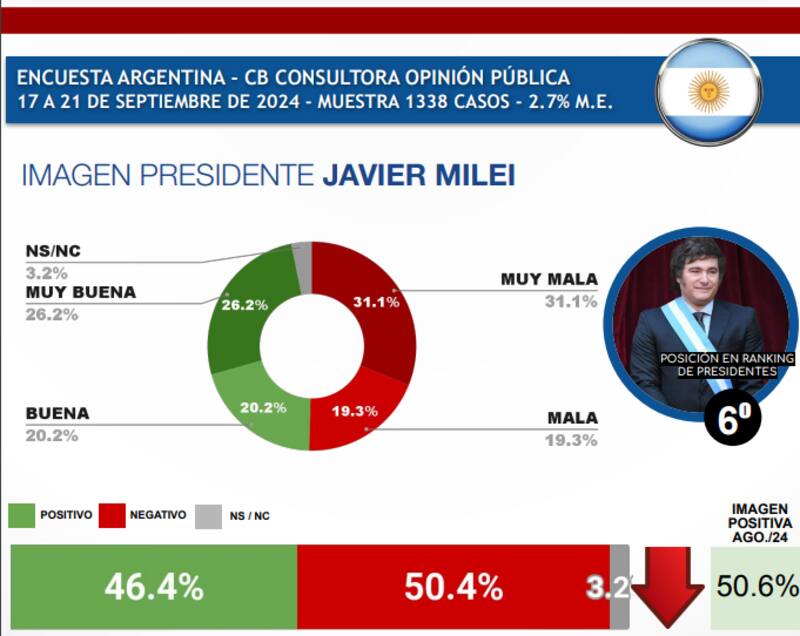 La imagen positiva del presidente Javier Milei registró en septiembre una caída del 4,2% respecto a agosto y se ubicó en 46,4%, mientras que la negativa trepó al 50,4%.