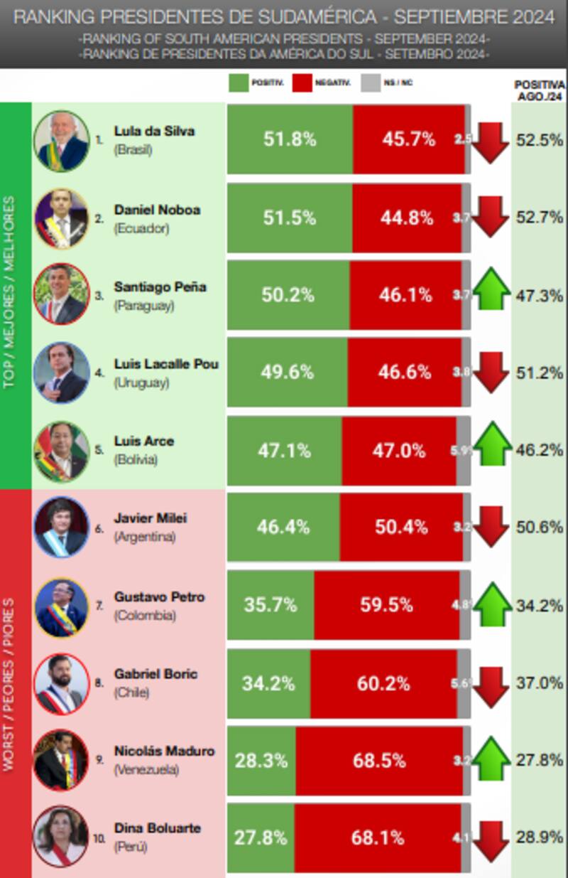 Los tres presidentes mejor valorados fueron Luiz Inácio Lula da Silva de Brasil en primer lugar con 51,8% de imagen positiva; Daniel Noboa de Ecuador con 51,5% y Santiago Peña de Paraguay, quien cerró el podio con 50,2% de aprobación.