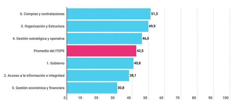 Donde mejor nota obtienen es en la divulgación de las compras y contrataciones, con 51,3 puntos sobre 100; estructura y organización, con 49,9 puntos, y gestión estratégica y operativa, con 46.