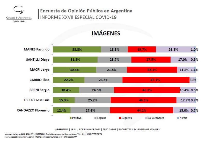 Sergio Berni, el único del Frente de Todos medido en este apartado, tiene 18 puntos a favor y 46 en contra. Peores registros tienen José Luis Espert y Florencio Randazzo, con 15 y 12 puntos de imagen positiva respectivamente.