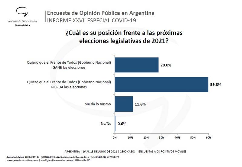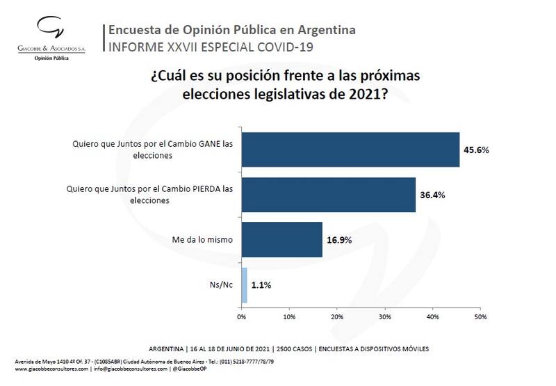 La misma consulta sobre Juntos por el Cambio registra respuestas en sentido contrario. El 46% quiere que la alianza opositora se imponga en las legislativas, contra un 36% que quiere que pierda. El 17% asegura que le da lo mismo.