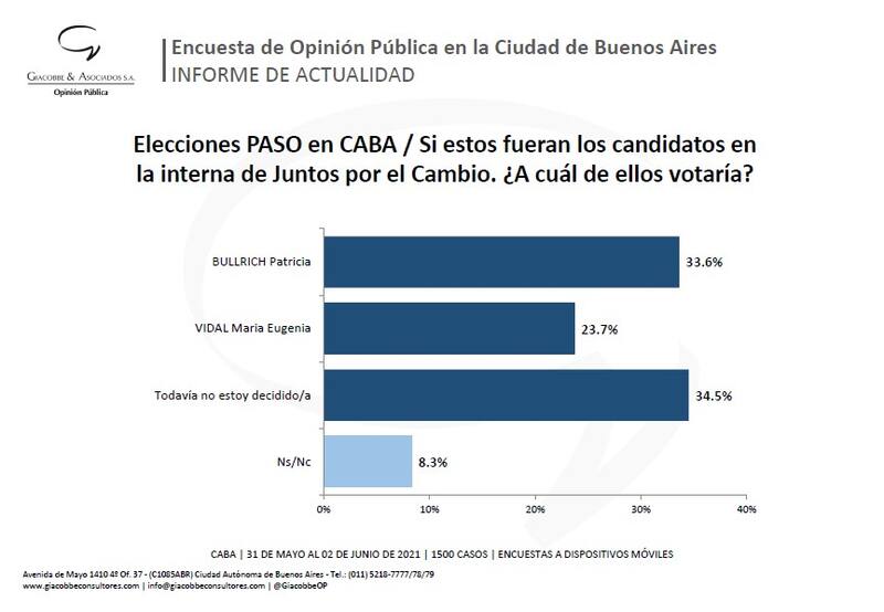 Finalmente, se consultó entre los porteños sobre la posible interna de Juntos por el Cambio en la ciudad de Buenos Aires. Patricia Bullrich sacó ventaja de 11 puntos sobre María Eugenia Vidal. La presidenta del PRO llegó al 34%, contra un 23 de la ex gobernadora bonaerense. Más de un tercio de los consultados aseguró no estar decidido.