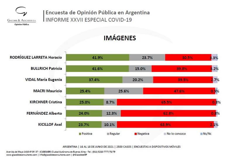 En cuanto a los dirigentes nacionales más relevantes, los que registran mayor imagen positiva pertenecen a la oposición. Encabeza Horacio Rodríguez Larreta, con 42% de imagen positiva y 30% de imagen negativa. Le sigue Patricia Bullrich, con 42% y 40% respectivamente. Son los únicos que cuentan con un diferencial a favor. María Eugenia Vidal completa el podio, con 37% de imagen positiva.