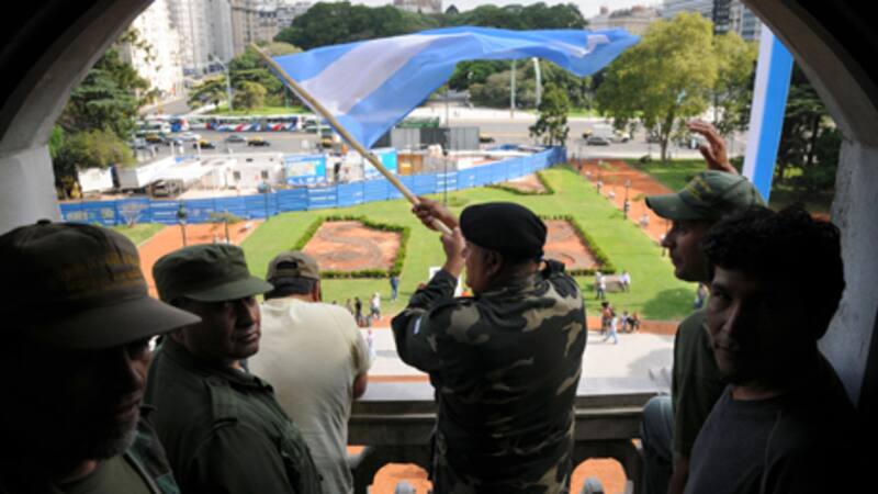 La Policía Federal espera que se retiren de manera pacífica. Hay banderas, carteles y algunos cohetes. Los ex conscriptos exigen una reunión con las autoridades nacionales para tratar el tema, a pocos días del 2 de abril.