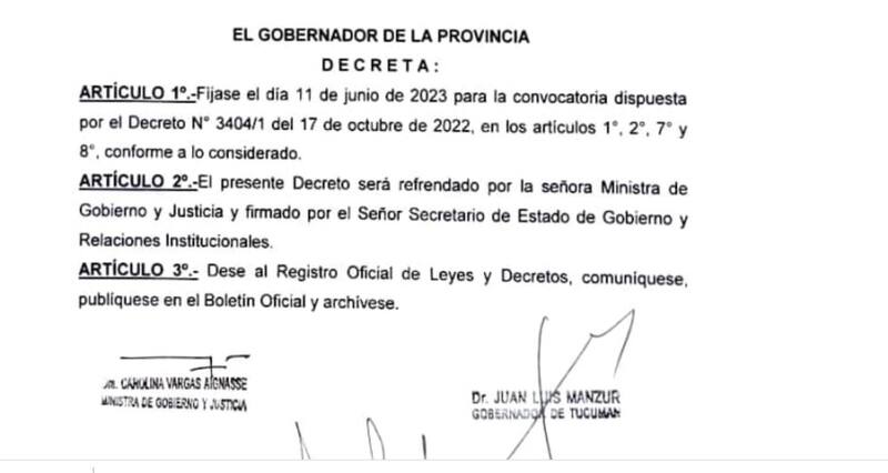 El gobernador de Tucumán, Juan Manzur, anunció en una conferencia de prensa realizada en la Casa de Gobierno que los comicios provinciales, que debían haberse realizado el domingo pero fueron suspendidas por la Corte Suprema, se llevarán a cabo el 11 de junio. Acompañado por el fiscal de Estado, Federico Nazur, Manzur firmó el decreto correspondiente con el llamado a elecciones.