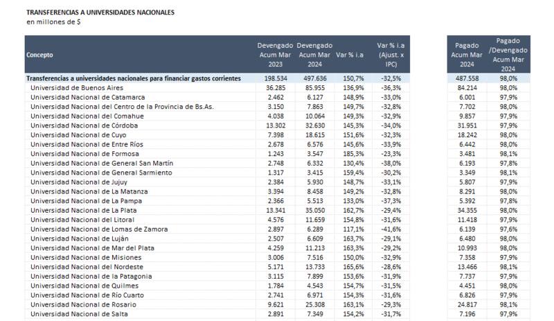 Según datos de la Asociación Argentina de Presupuesto y Administración (ASAP), hasta el mes de marzo las transferencias a las universidades nacionales públicas fueron de -32,5% (ajustado por inflación). En el caso de la Universidad de Buenos Aires, esta variación asciende al -36,5%; y en la gran mayoría de los casos la cifra oscila entre -30% y -40%.