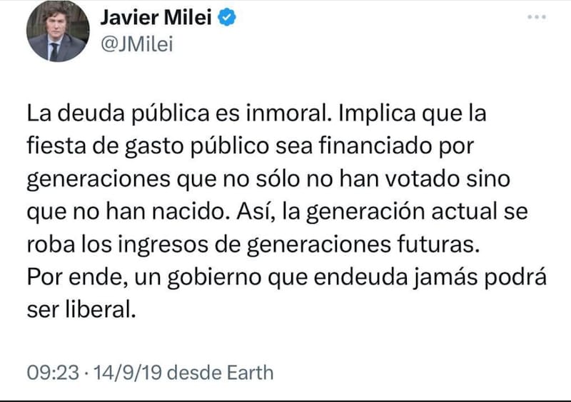 En un posteo en su cuenta de Twitter, Guzmán reprodujo un viejo tuit de Milei, en el que el actual presidente sostenía que "la deuda pública es inmoral".