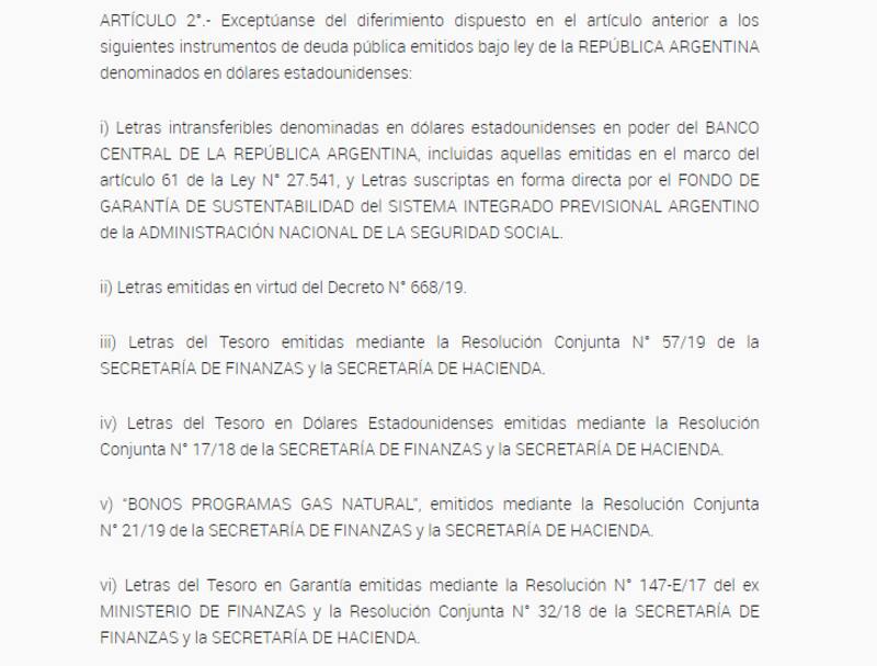 Todos estos títulos quedaron específicamente excluidos del DNU de abril que estableció el diferimiento del pago de intereses para la deuda denominada en dólares y bajo legislación local, en el artículo n°2 de la norma.