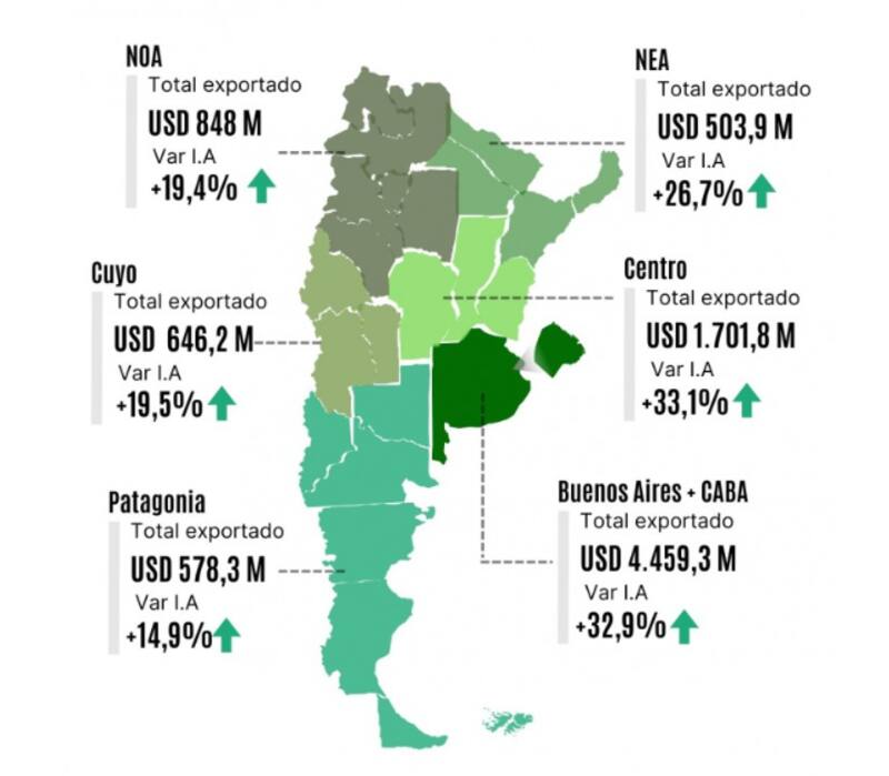 En paralelo, sobre la distribución de las exportaciones por región según el domicilio fiscal de los productores el informe señaló que Buenos Aires y CABA representan el 50,8% del total exportado, con ingresos por u$s 4.459,3 millones, un incremento interanual del 32,9%. El complejo porcino y caprino fue el más destacado, generando u$s 433,4 millones (9,7% del total regional).