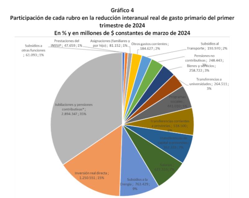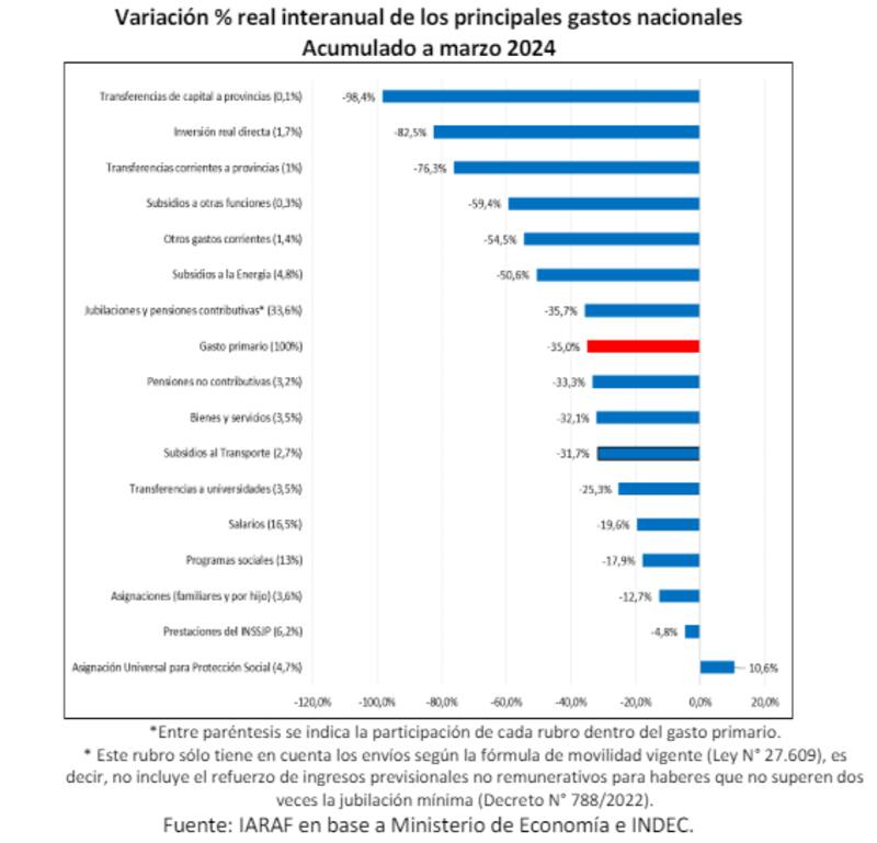 De acuerdo con los datos de Iaraf, durante el primer trimestre del año, los ingresos totales cayeron un 4,5%, mientras que el gasto primario descendió un 35% interanual real. "Las Jubilaciones y pensiones soportaron el 35% de la reducción total, la inversión real directa el 15%, las transferencias a provincias el 13%, subsidios a la energía el 9% y salarios el 7%, entre los más importantes", remarcó el Instituto.