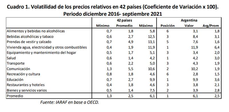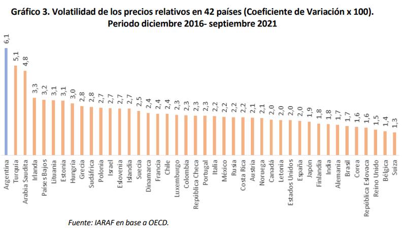 Por otra parte, el estudio del Iaraf remarcó que la Argentina "siempre está entre los seis países con precios relativos más volátiles".