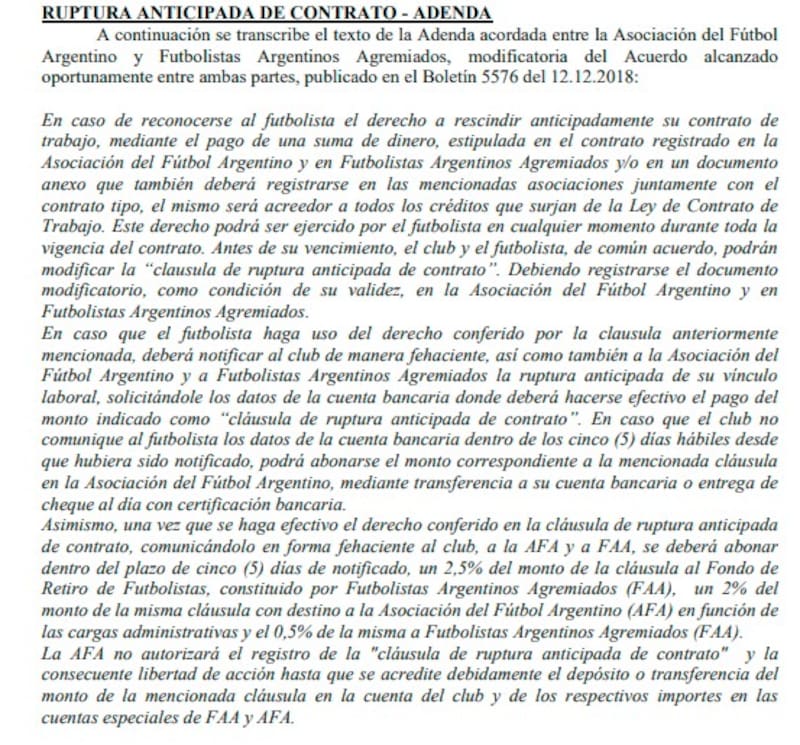 "Una vez que se haga efectivo el derecho conferido en la cláusula de ruptura anticipada de contrato, comunicándolo en forma fehaciente al club, a la AFA y a FAA, se deberá abonar dentro del plazo de cinco (5) días de notificado, un2,5% del monto de la cláusula al Fondo de Retiro de Futbolistas, constituido por Futbolistas Argentinos Agremiados (FAA), un 2% del monto de la misma cláusula con destino a la Asociación del Fútbol Argentino (AFA) en función de las cargas administrativas y el 0,5% de la misma a Futbolistas Argentinos Agremiados (FAA)", señala la normativa, que fue modificada en base a un acuerdo previo entre la AFA y Agremiados en diciembre de 2018.