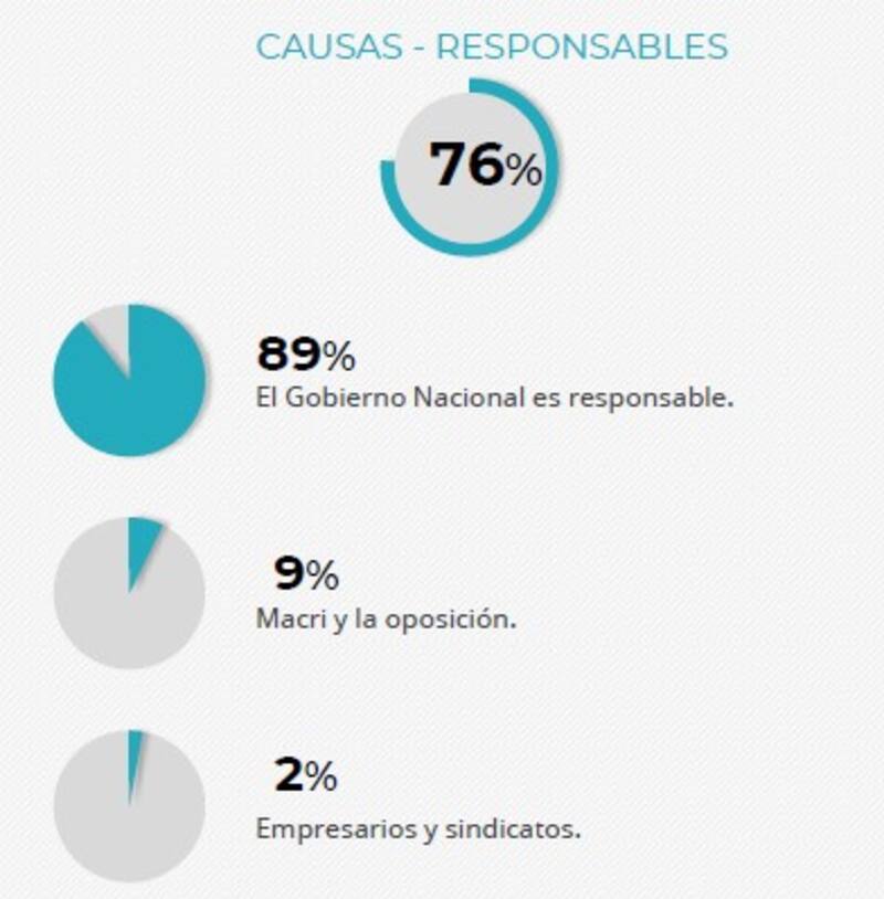 Dentro del primer universo, se identifica claramente un responsable: el gobierno nacional, según el 89%. Mientras tanto, un 9% se enfoca en Mauricio Macri y la oposición, y el restante 2% apunta a empresarios y sindicatos.
