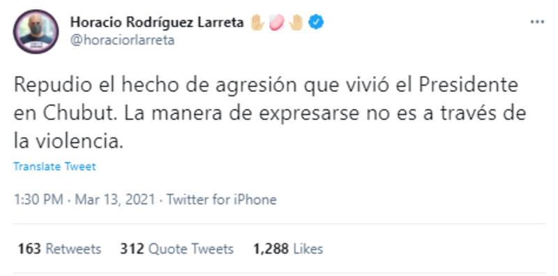 En esa misma línea se expresó Rodríguez Larreta, quien deslizó: "Repudio el hecho de agresión que vivió el Presidente en Chubut". Y enfatizó que "la manera de expresarse no es través de la violencia".