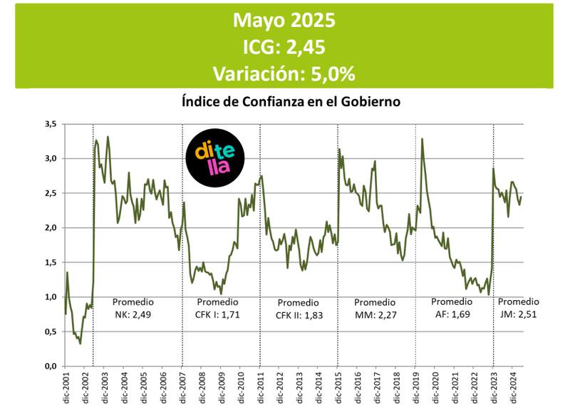 En ese marco, el Índice de Confianza en el Gobierno (ICG) que elabora mensualmente la Escuela de Gobierno de la Universidad Torcuato Di Tella mostró en mayo un crecimiento del 5% respecto de abril, cortando así una racha de cinco caídas consecutivas. El indicador se ubicó en 2,45 puntos sobre un máximo de 5, y recuperó el 36% de la confianza que había perdido desde diciembre de 2024.Aunque el nivel actual (2,45 puntos) sigue siendo 2,7% inferior al registrado en mayo de 2017, durante el gobierno de Mauricio Macri, supera en 26,7% la medición de mayo de 2021, bajo la administración de Alberto Fernández.