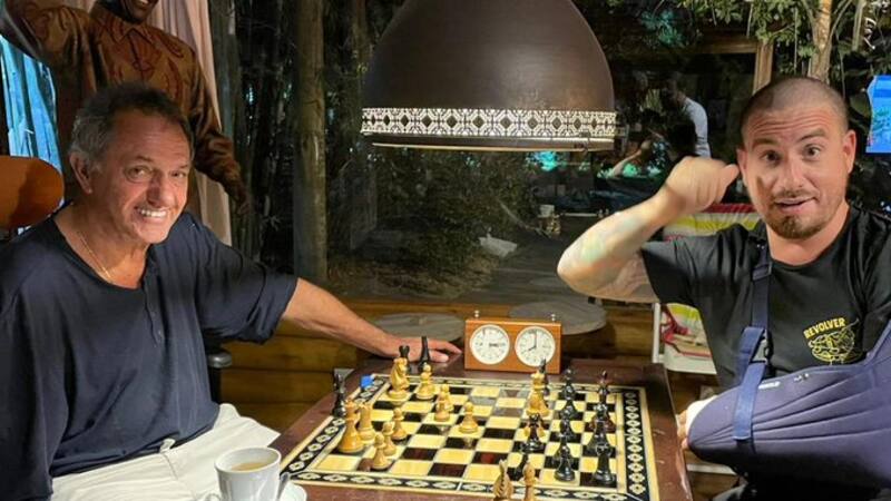 También el Presidente tuvo un gesto con Scioli y en la mañana del sábado le presentó a su bebé, Francisco. Tal vez por esa imagen el ex gobernador se volvió a Brasilia optimista y esperanzado -fiel a su estilo- y compartió una foto de su encuentro en La Ñata con Federico Bal, mediático al que ayudó por una accidente que sufrió en un programa de TV justamente en Brasil. "Jaque mate al pesimismo", tuiteó una foto juntos el embajador mientras disputaban una partida de ajedrez