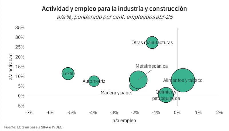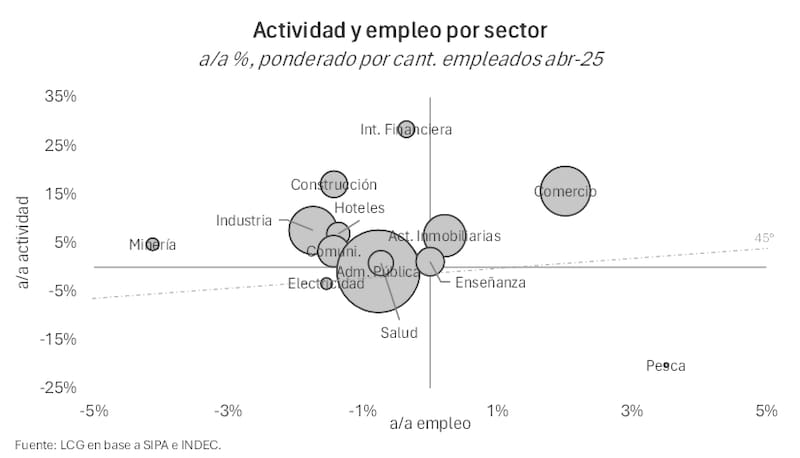 "Con datos a abril de 2025, en la comparación interanual, la mayoría de los sectores productivos mostró una recuperación de la actividad", indicó la consultora, señalando que "la actividad estaba muy golpeada en abril de 2024".