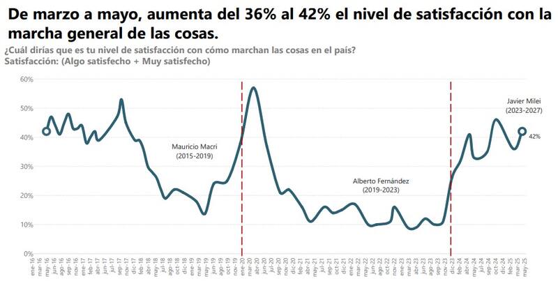 Al mismo tiempo transcurrido de gobierno, la satisfacción con la marcha general de las cosas se encuentra por encima de Macri (38%) y Fernández (13%).