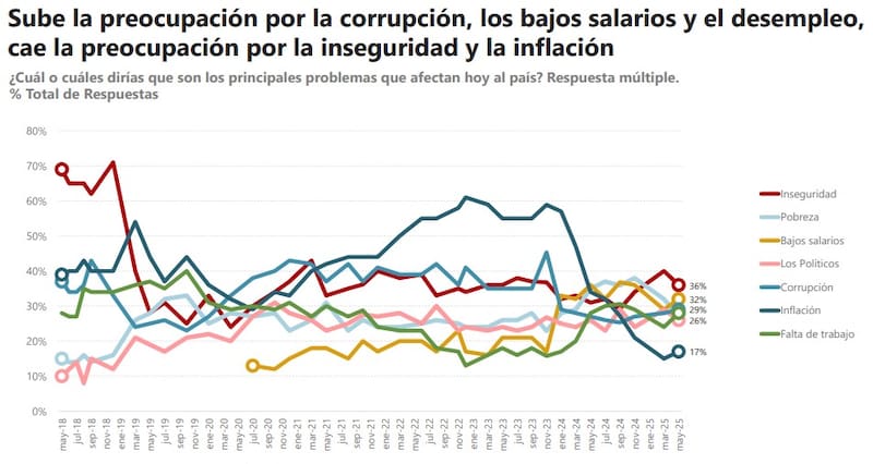 Para los entrevistados los principales problemas son la inseguridad (36%), los bajos salarios (32%) y la corrupción (29%). Problemas como el cambio climático (2%), el gasto público (4%), la obra pública (7%) y el acceso a vivienda (7%) cuentan con una menor cantidad de votos. Otros problemas como los políticos (26%), la justicia (19%), la inflación (17%) y el endeudamiento externo (16%) se ubican al medio.