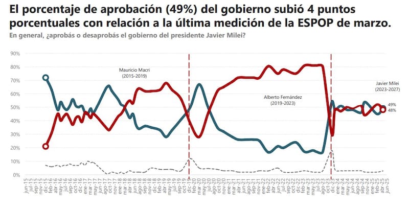 Sobre el nivel de aprobación, a mediados del segundo año de gobierno, disminuyó al 42% mientras que la desaprobación es del 55%. A esta altura, Macri contaba con un 40% de aprobación y Alberto Fernández con el 16% en el mismo período, se detalla en la encuesta.