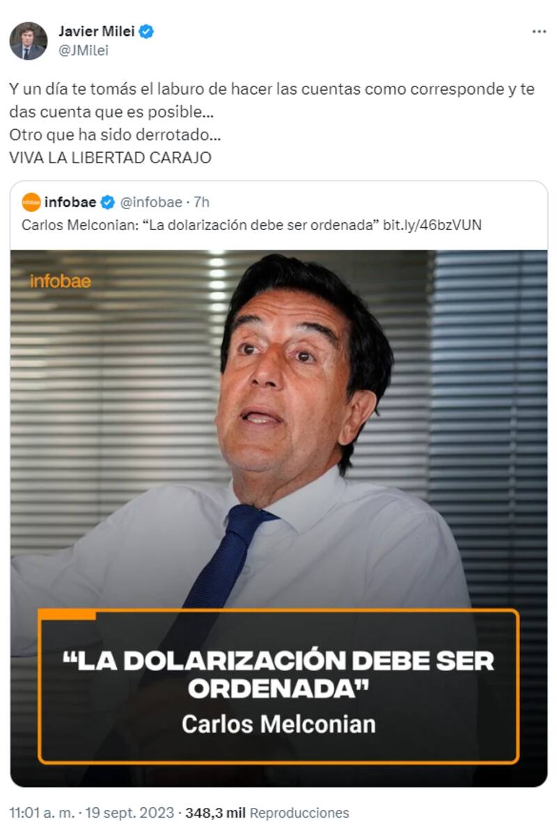 "Y un día te tomás el laburo de hacer las cuentas como corresponde y te das cuenta que es posible... Otro que ha sido derrotado... ¡VA LA LIBERTAD CARAJO!", comentó Milei.
