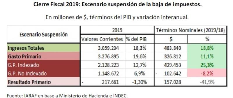 En un detallado análisis de todo el cuadro fiscal (que se puede consultar completo al final de esta nota), desde el Instituto Argentino de Análisis Fiscal (IARAF) alertaron sobre la necesidad de "una discusión correcta" y estimaron que el monto del ajuste oscilaría entre $ 148.000 millones y $ 103.000 millones dependiendo de dos escenarios: uno en el que se mantiene el actual esquema de reducción de impuestos (es decir, que continúe el cronograma de baja gradual de retenciones a la soja y también los impuestos incluidos en la reforma tributaria) y otro en el que se suspenden esas reducciones, lo que permitiría robustecer los ingresos.