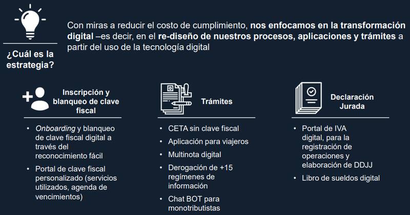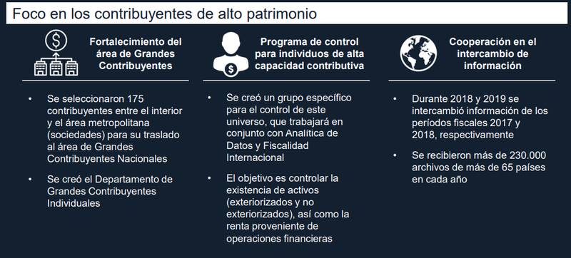 Otros puntos que el documento elige poner de relieve son la “transformación digital del organismo; la creación y el fortalecimiento de áreas clave como seguridad de la información, el instituto de investigaciones y la analítica de datos; la colaboración con otras áreas de Gobierno y el trabajo por la institucionalidad y la cultura tributaria, con foco en los contribuyentes de alto patrimonio.