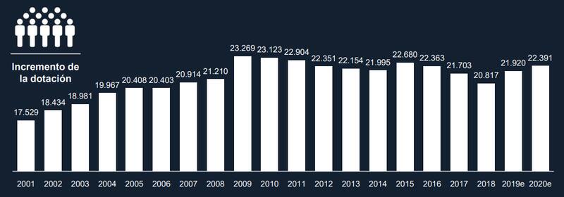 También subraya el achicamiento del gasto en salarios en relación al porcentaje de ingresos (la proyección es que este año habrá sido del 85%, el nivel más bajo desde el último año de gobierno de Néstor Kirchner)... y eso a pesar de que en 2019 ingresó nuevo personal, quebrando la serie de ajustes de planta que se inició en 2016.